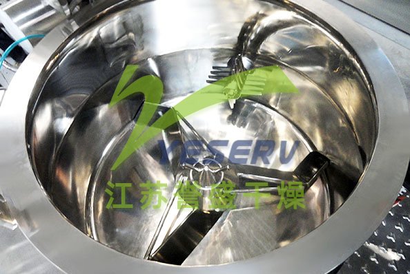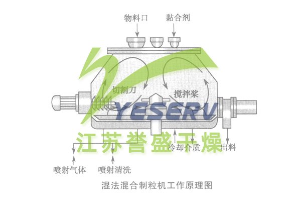 粉體物料與粘合劑在圓筒形容器中由底部混合槳充分混合成濕潤軟材,然后由側置的高速粉碎槳切割成均勻的濕顆粒。